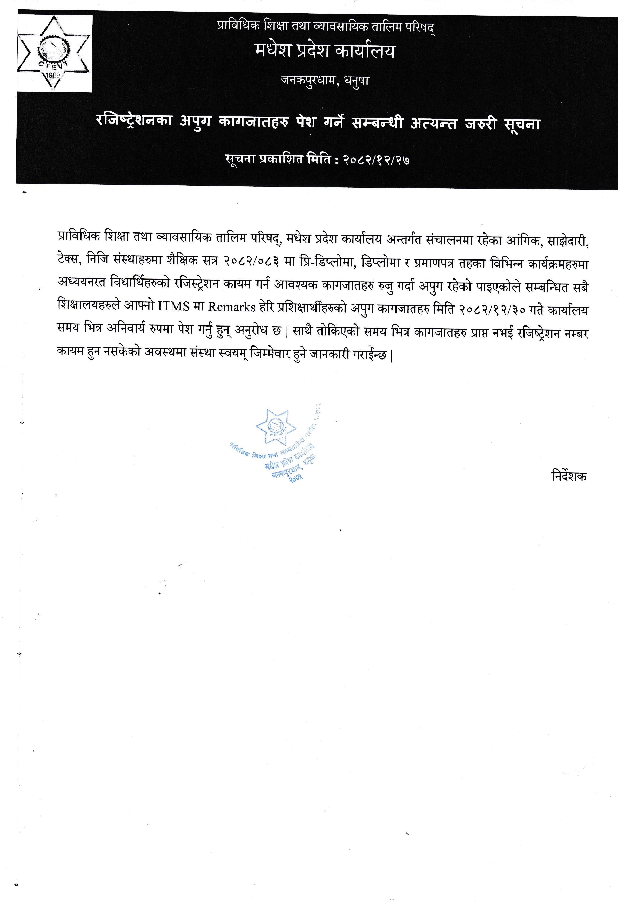 रजिष्ट्रेशनका अपुग कागजातहरु पेश गर्ने सम्बन्धी अत्यन्त जरुरी सूचना